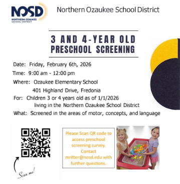 3 or 4-year-old preschool screening will take place on Friday, February 6th, 2026, between 9:00 am and 12:00 pm. If you have a child that you would like to be
